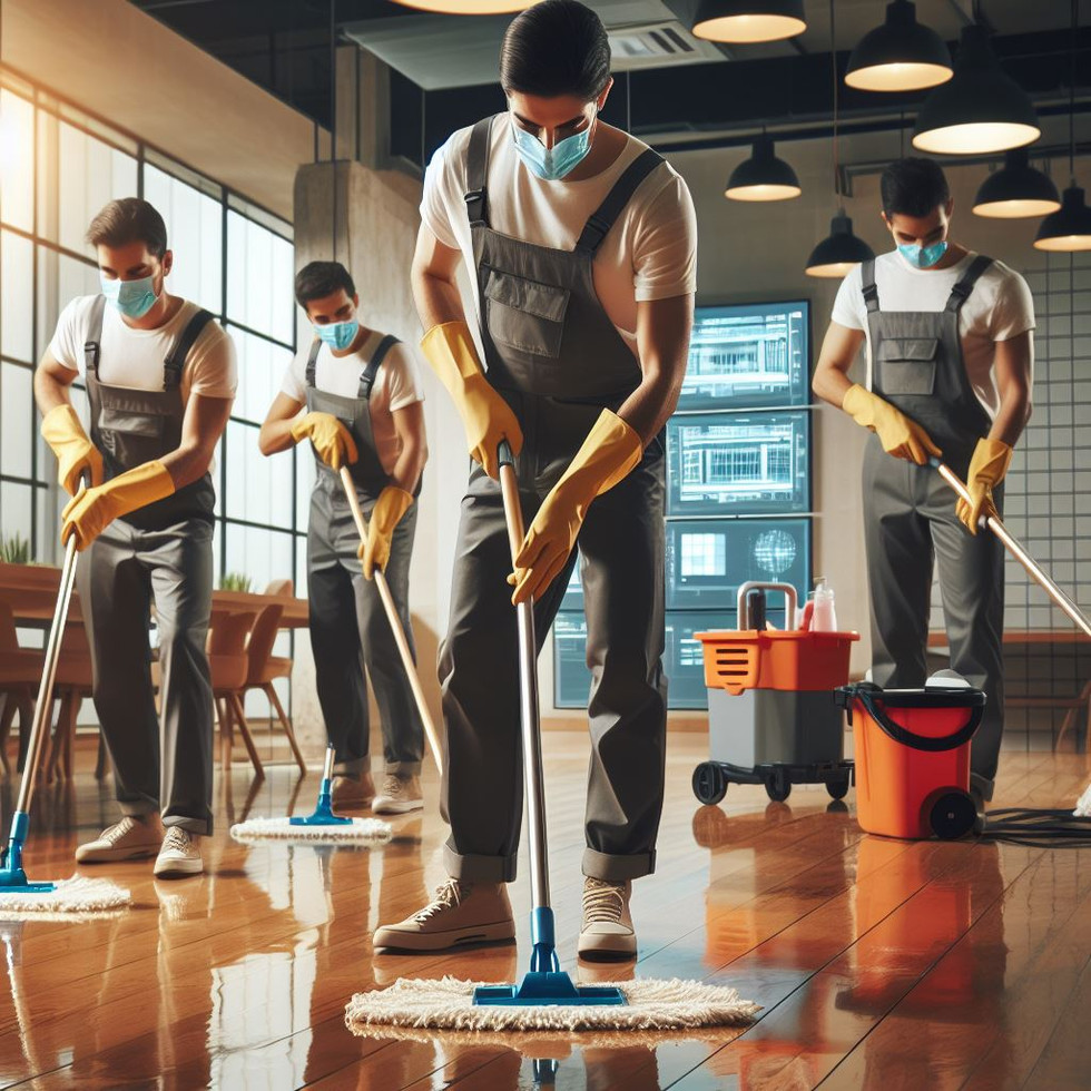 1. Sweeping or Vacuuming: Debris and dust are removed from the floor.